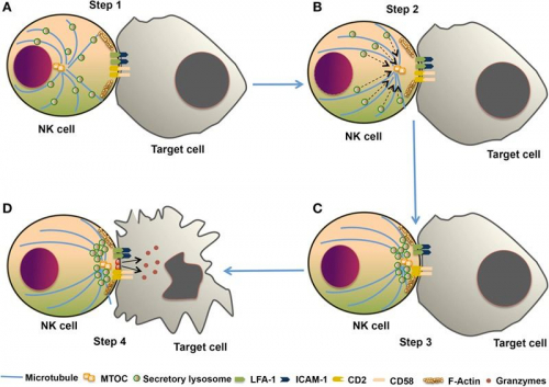 自然杀伤 (NK) 免疫细胞的细胞毒性反应针对癌症和病毒感染的细胞。 在第一步 (A) 中,NK 细胞识别目标细胞并向其聚集。在第二步 (B) 中,细胞重组其内部结构以朝向目标细胞定向。第三步 (C) 包括 NK 细胞对接并靠近目标癌细胞。第四步也是最后一步 (D) 需要 NK 细胞破坏目标癌细胞,使其爆裂。