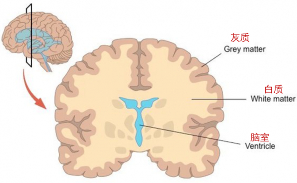 不过,聊到脑灰质,很多人估计很容易联想到另外一种大脑结构:脑白质。如下图所示,我们可以直观的看到大脑在解剖结构上分为脑灰质、脑白质以及脑室。
