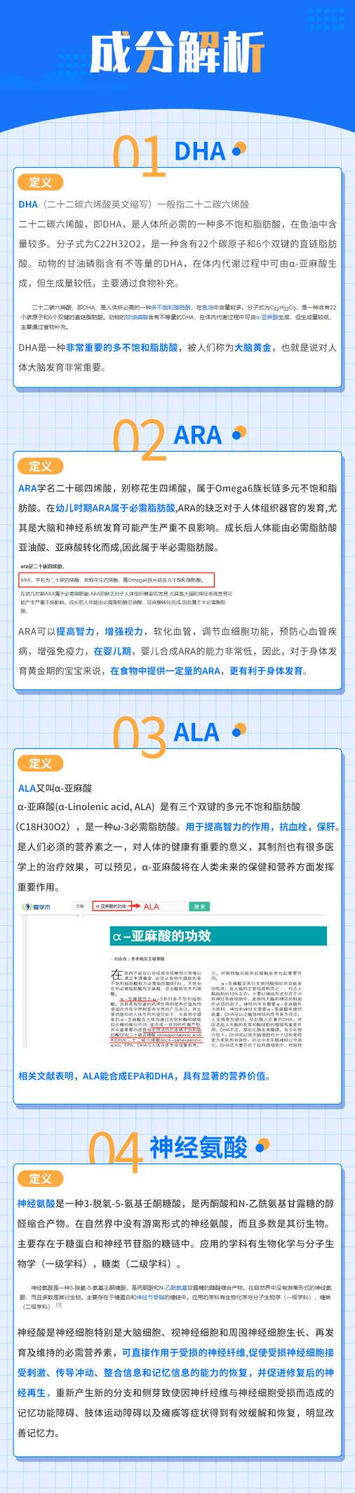 而复合型的DHA补充剂中,除了还有DHA之外,还添加了ARA,ALA和神经氨酸等多种营养物质,能更快更直接的促进孩子的大脑发育。