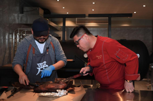 严方院位于昌平区延寿镇北庄村,栗子树、栗蘑、果树是当地主要经济作物。民宿主人现场展示了基于果木熏烤的美式Brisket,将整块的牛前胸肉经由枣木、栗树树枝12小时慢火烘烤,吸收了果木的热度与香气,烤完后再历经数小时静置“醒肉”,让汁水均匀分散在牛肉纤维与脂肪中,吃起来每一口都鲜嫩爆汁、醇香浓郁。