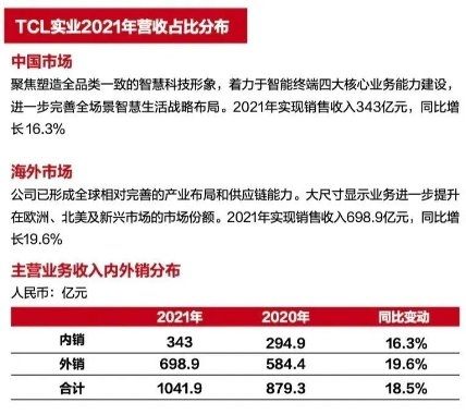 数据显示,TCL通过TCL科技与TCL实业两大主体在全球范围内建立了完善的供应链体系,业务遍及亚、美、欧、拉美及大洋洲,在全球各地设有43个研发中心、32个制造基地,销售机构遍布80多个国家和地区,业务范围超过160个国家和地 区。