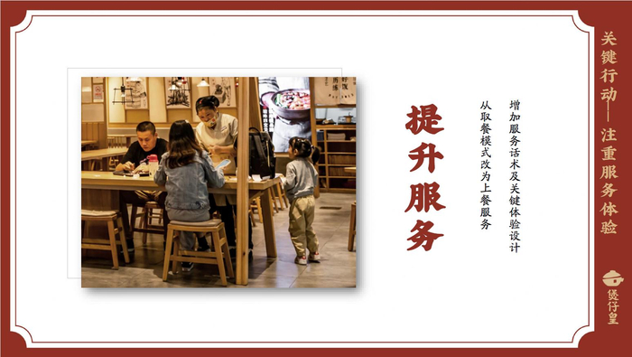 第二步,围绕定位重新构建单店模型。首先,提升制作工艺 ,顾客是要吃锅巴和锅气,为此,我们升级了光波炉炉灶,热值更高保证锅巴质量更好更酥脆;自主研发了砂锅,采用高质量的原材料,统一的硬度厚度标准,保证热传导速度一致,最终实现煲仔饭出品的标准化。其次,重新布置门店平面的动线 ,把厨房烧煲仔的地方变成了明档,推到最前面,顾客一眼就看到一排砂锅在那冒着热气,视觉、嗅觉上都有直观感受,增加了进店率。再次,通过产品、环境、服务升级来支撑高客单价提升利润率 ,产品开发设计时调整不同食材的组合配比,优化产品线和菜单结构,突出煲仔饭现做的手工感和价值感;老木屋檐土灶瓦煲,加民国版画风让门店环境更有仪式感;服务从取餐模式改为上餐服务,增加服务话术和关键体验设计,比如服务员会在上桌之前会跟客人说煲仔饭要晚一点撬锅巴会更酥脆,然后帮客人掀盖等等。这一系列动作下来以后,我们的生意就有了很大的变化。