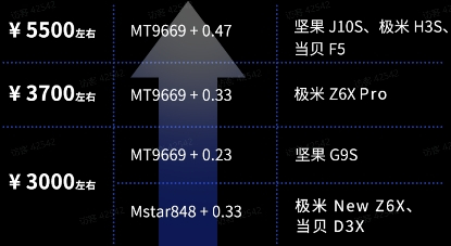 细心的你,是否发现这三款投影仪主要是SoC和DMD不同?坚果G9S采用的是MT9669旗舰芯片,搭配的是0.23DMD。而其它两款机器采用的是Mstar848和0.33组合。相比之下,坚果G9S的SoC更强,但DMD偏弱。