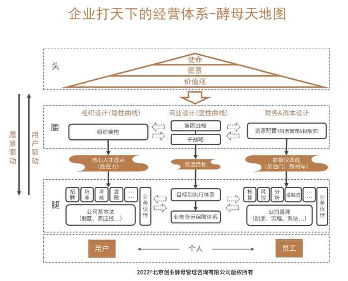在拜访上千家企业之后,他们总结出一套行之有效的分析企业的酵母天地图。今天,许多企业老板会把这张图挂在自己办公室,像作战地图一样,排兵布阵,指挥调度。天地图由头部、腰部和腿部构成。头部是企业的天眼,是使命、愿景、价值观,反映的是企业未来发展的高度;腰部开始分化出业务、组织、资本三个模块,它是否强壮决定了企业系统结构的稳定性;腿部的执行系统是企业的“地基”,决定了企业当下每一步走得是否扎实。