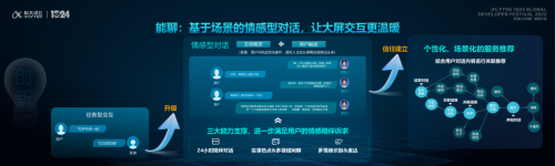 其一,基于场景的情感型对话,让大屏交互更温暖。相比对传统的指令性交互,必须等待用户主动说话然后系统进行机械师回复的方式,家庭用户对大屏交互提出更高层次的要求。科大讯飞通过多模态感知及表达、主动对话等技术赋能,在iFLYHOME OS 2.0上升级AI交互对话系统能力,系统会在合适的场景下主动进行电视助手的关怀引导和情感化表达,如用户之前搜索的缺失影片更新上映了,系统会主动进行提醒,实现热门影片推荐服务闭环。