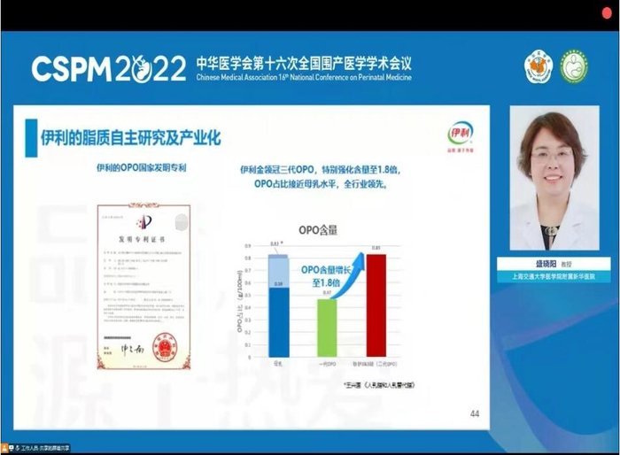 同时,中国营养学会妇幼营养分会副主任委员、上海交通大学医学院附属新华医院发育行为儿童保健科主任医师盛晓阳教授担任报告专家,以《母乳研究最新成果及临床实验》为题作学术报告。报告中提到,母乳中成分OPO结构脂可与可溶性膳食纤维组合,帮助增加肠道内双歧杆菌的数量,改善胃肠道环境,激活免疫细胞,降低婴幼儿胃肠道疾病的发生风险。