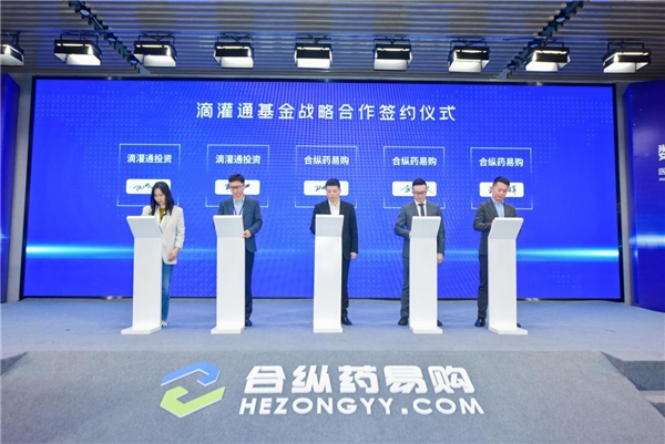 合纵药易购总裁陈顺军、高级副总裁李宇欣、合纵药易购医疗服务事业部总经理王赛辉、滴灌通投资副总裁吴建晓、滴灌通投资助理副总裁刘晨燕共同出席签约仪式