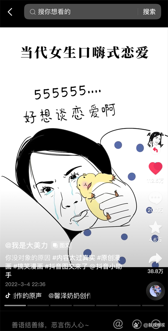 随后,我是大美力乘胜追击,迅速推出《女生口嗨式恋爱》,形象地展现了当代单身女孩矛盾的心理状况:想要恋爱却又死宅,“嘴上的巨人,行动上的矮子”,引发粉丝强烈共鸣,播放量近6000万,评论20w+,转发38w+。