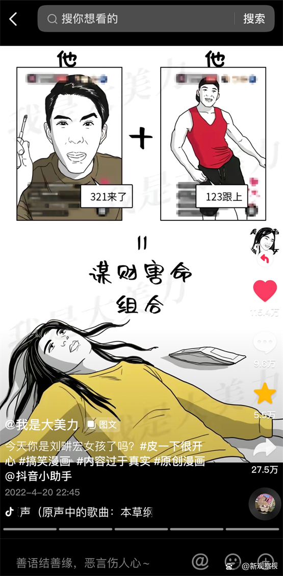 以《当代女生又爱又恨的两个男人》为例,博主将刘畊宏与李佳琦组成的“谋财害命”组合进行联动,这其实是对“刘畊宏女孩”趋势的一种洞悉。图文发布第二天,刘畊宏本人抖音账号达到涨粉巅峰值:一天涨粉近千万,我是大美力也在这股风潮中连续霸屏抖音热搜榜5次。