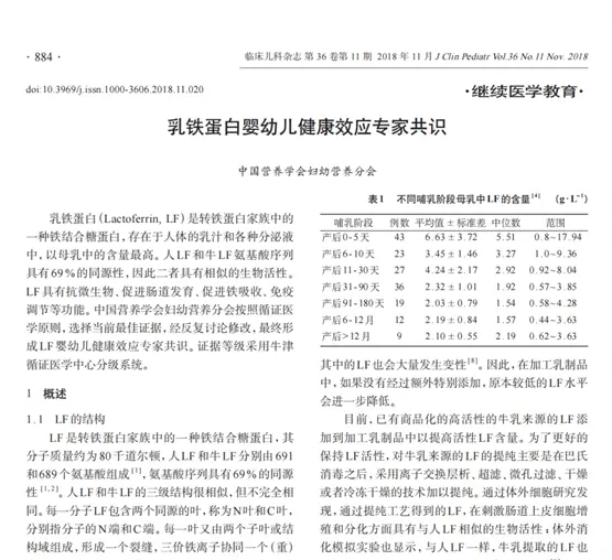 由中国营养学会妇幼营养分会编写,近20名国内权威营养学专家联合发布,并发表在《临床儿科杂志》上,明确表明乳铁蛋白与婴幼儿、儿童、孕妇健康效应的6大研究证据:
