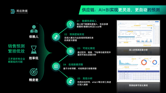 我们目的是希望通过AI+BI相结合,实现更加灵活、更加自动化的预测,解决从前依赖人、精度不高、效率也受限的难题。 当然在这里面并不是说以后都完全不需要人,而是人和系统的更好的结合。