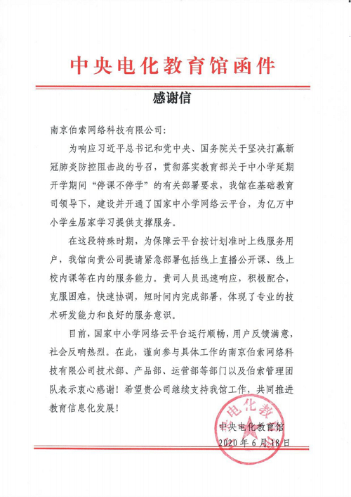 2020年3月全国“停课不停学”期间,伯索科技承担中央电教馆的“国家云课堂”建设,凭借专业的技术研发能力和良好的服务意识,快速响应、攻坚克难,得到了中央电化教育馆的高度认可。