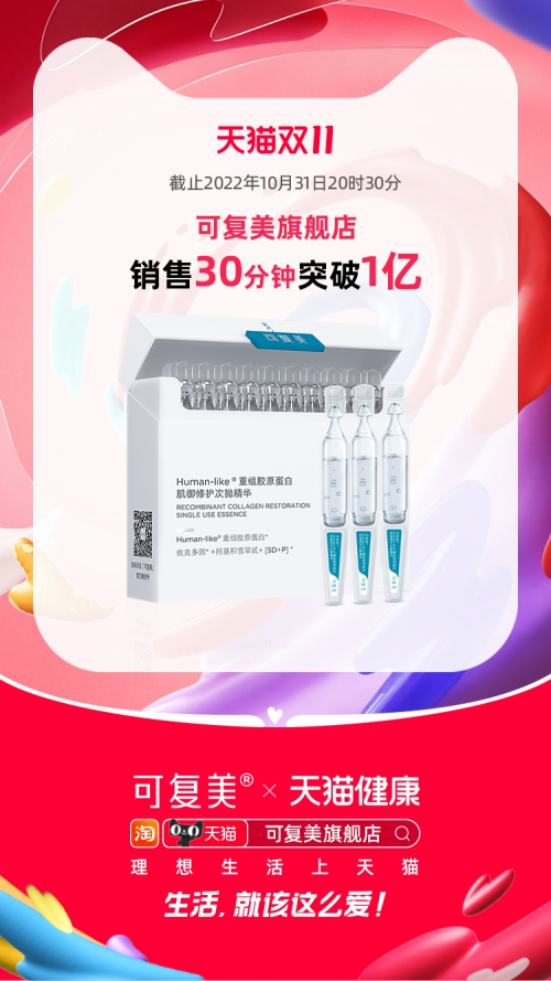 双十一期间,可复美全渠道GMV同比增长130%,且在天猫、京东、抖音、唯品会等渠道均迎来高质量增长,持续领跑行业。据战报数据显示,可复美天猫官方旗舰店开售3分钟突破千万,开售30分钟突破一亿,开售40分钟超越了去年全周期,GMV同比增长125%。最后毫无悬念拿下天猫医疗器械类目GMVTOP1、天猫面部健康类目GMVTOP1、伤口敷料类目GMVTOP1、保健用品类目GMVTOP1,值得一提的是,可复美还斩获了京东平台双十一医用美护类目GMVTOP1,证明了品牌当之无愧的实力。
