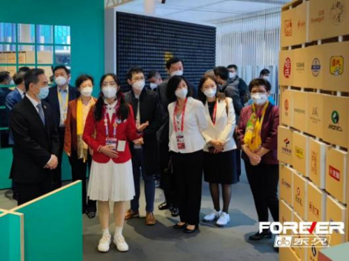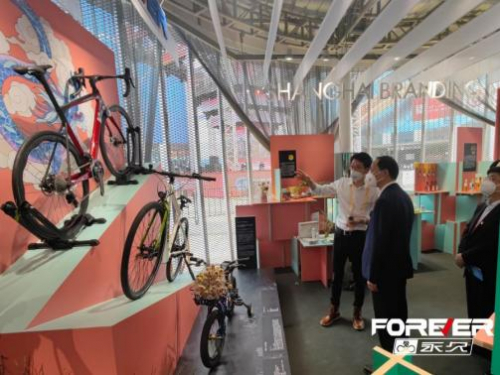 11月5日进博会开幕日,进博会上海馆馆长带领国际贸易促进委员会会长:任斌参观上海馆场内陈列并对永久自行车做详细解说,会长认真倾听永久自行车品牌发展历程,肯定了永久自行车勇于讲述品牌故事、传播中国声音的自信。