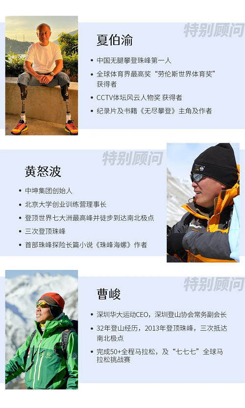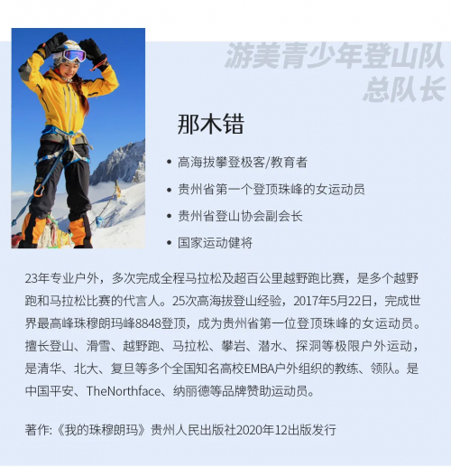 本登山队将由国家运动健将、贵州第一位登顶珠峰的女运动员、贵州登山协会副会长那木错担任游美青少年登山队总队长,制定科学、规范的登山计划、组织专业的登山后勤及安全保障团队,全面负责游美青少年登山队和登山预备队队员的登山安全。同时中国无腿登顶珠峰第一人夏伯渝;中国著名企业家、登山探险家黄怒波、中国户外运动标杆性人物曹峻担任游美青少年登山队特别顾问。