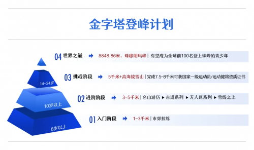 游美登峰计划,为游美旗下巅峰探险系列高阶产品。我们将汇集全球有理想、有力量的青少年组建成游美登山队,参与到游美青少年进阶式“向上”成长路径当中,以“心向巅峰,志在高远,脚踏实地,步步为营”为理想信念,经过三到五年高海拔的严格攀登训练与选拔,在国家运动健将、贵州珠峰女子攀登第一人那木错的带领下,从5000米到7000米再到8000米高海拔登山挑战,直至最后完成世界之巅8848.86m珠穆朗玛峰登顶。