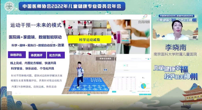 南京医科大学附属儿童医院的李晓南主任,对肥胖的多学科管理,进行了讲解。李主任表示,“肥胖的管理除了多学科联合管理外,还要充分考虑跨学科的合作,要充分挖掘互联网技术,在儿童运动处方的应用。”李主任还结合喜高科技的《中国儿童体格健康运动处方系统》,阐述了未来运动干预的新模式,将是医院端+家庭端,数据智能联动模式。