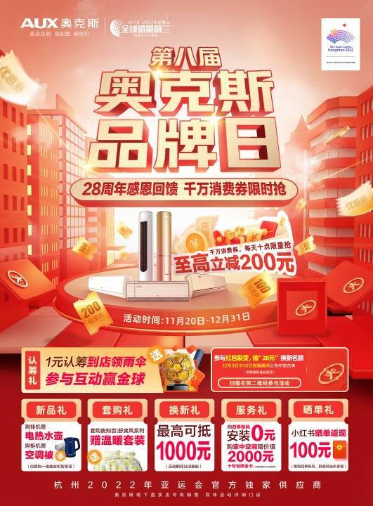 双十一品牌营销拉锯战刚刚落下帷幕,奥克斯空调品牌大促再次蓄势待发。11月20日至12月31日,奥克斯空调迎来一年一度的品牌日活动,推出多重福利玩转花样营销,钜惠营销回馈用户。12月3日第八届奥克斯空调品牌日当天,奥克斯空调好礼不断,千万消费券、多重认购好礼、增值服务回馈等应接不暇,旨在掀起一轮专属奥克斯空调用户的购物狂欢。
