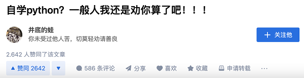 从该话题下的高赞讨论来看,多数人对Python的应用性都持肯定态度,但在门槛上却褒贬不一,有人认为Python能够让新人很快入门,从而在初始阶段就获得成就感,提升兴趣度;而有人则坚持长远发展观点,认为Python在语法上隐藏了大量概念,比如类型、多态应用原理等,如果基本功不扎实,即便是新手入了门,也难以进一步深入。