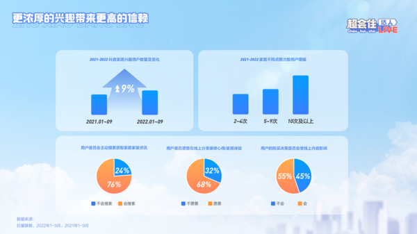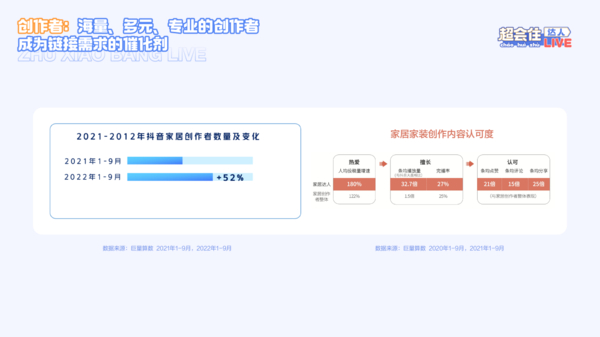 就像“人人都能说五分钟脱口秀”,在自媒体时代,人人也都可以成为“闪闪发光”的内容创作者。技术可及性的提高,使得创作门槛大大降低,越来越多人涌入创作者赛道。就家居类而言,据巨量算数相关数据,2022年1月~9月,家居类创作者数量同比增长52%,与此同时,家居相关内容播放量稳定增长,近8成用户会主动搜索获取家居家装资讯。这意味着强烈的用户内容消费需求将给创作者带来巨大的流量和商业机会。