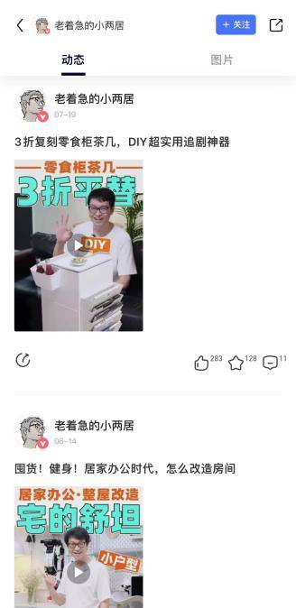 富有天马行空想法且动手能力强的达人们,或许可以从@老着急的小两居 账号中找到运营灵感。对空间改造、旧物DIY有着独特想法的他,凭借极强的手工能力,用一件百元鞋柜把收纳空间翻倍、改造百元格子柜完美平替千元零食柜......这些都无不生动地诠释着脑洞大开、动手DIY于用户的魅力。自2020年4月21日入驻以来,@老着急的小两居 已收获了大量粉丝。