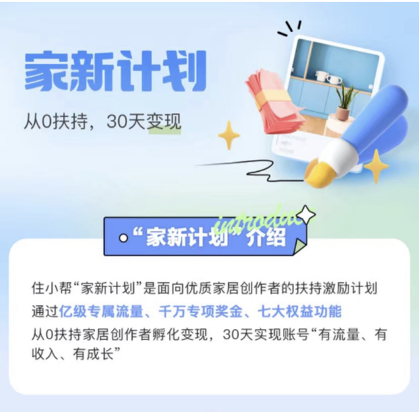 近日,住小帮推出了针对创作者的「超会住达人LIVE」活动,其中的「家新计划」,通过亿级专属流量扶持、千万专项奖金、七大权益功能助力家居创作者们30天实现账号“有流量、有收入、有成长”。