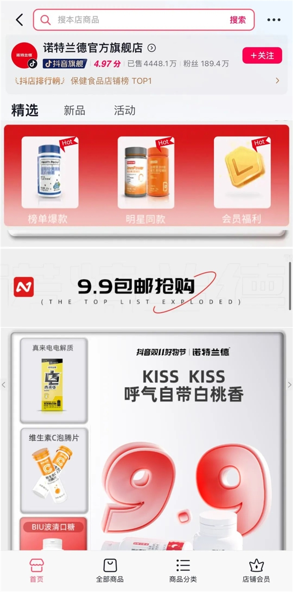 基建做好以后,在618小试牛刀,起了一点销量;真正的爆发是在抖音电商921大促,整个大促13天,GMV比618增长了几十倍,同时搜索诺特兰德的品牌词和店铺会员数,也有了很大的增长,尤其是店铺会员的沉淀,对品牌商家至关重要,这是内容场运营难以做到的,也是货架电商的优势。