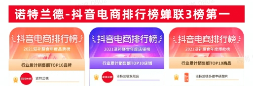 抖音电商庞大的流量聚合,让他们发现用户营养需求还远远未被满足,他们发现抖音上不但缺少专业的运动营养产品,大众健康营养的认知也很缺乏,于是开始做营养多元化,从小众走向大众,推出了维生素、矿物质、益生菌等多个产品,其中一款多种维生素产品,在去年618,被打造成为首个爆款产品,诺特兰德也从这一年开始在抖音渠道实现超量增长,荣获了抖音电商2021年度滋补膳食行业品牌榜、爆款榜、店铺榜3榜的TOP1。