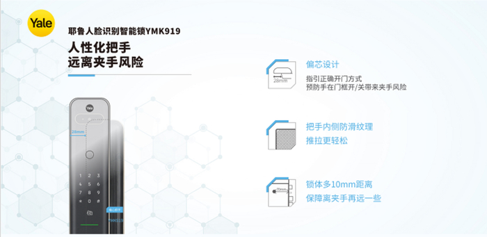 Yale耶鲁YMK919智能锁系列的亮点是创新的防夹手设计,它消除了市场上现有推拉式智能锁普遍存在的 "夹手指 "问题。手柄的推拉功能使用户能够以最小的力气开锁,而纤薄的机身和圆润的边缘确保任何年龄的用户--包括儿童和老人--能够安全地操作这款符合人体工程学的智能锁。