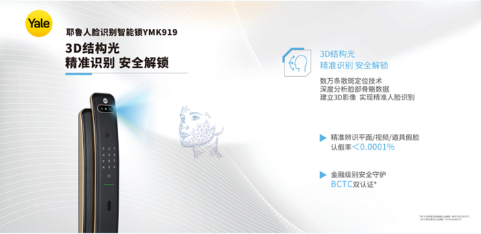 当市面上的智能锁产品多不胜数,唯有不断创新方能赢得客户青睐。为提升产品安全性能,Yale耶鲁YMK919采用了创新的3D结构光设计,该功能将在用户接近前门时进行检测、扫描和识别;在距离前门40厘米到100厘米的区域内,面部特征可以精准识别并在几秒钟内解锁。其内部红外相机、红外激光投影仪、智能芯片,无论是白天还是夜晚都能够更精准地提取面部深度信息,模组识别技术还获得了BCTC(国家金融测评中心、银行卡检测中心)双认证,达到金融级安全标准,人脸误识别率小于0.001%,完全不用担心被视频、照片破解。