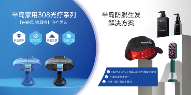 308nm紫外光治疗是目前临床公认最佳治疗方案,但长期以来,医疗资源、临床与患者的矛盾,白癜风、银屑病患者饱受反复奔波、治疗周期长困扰。白癜风家用型治疗仪器的需求越来越迫切,由此,半岛家用308光疗仪应运而生。此次展会中,半岛医疗也将带来半岛308准分子光疗仪、半岛祛白精灵两代产品。