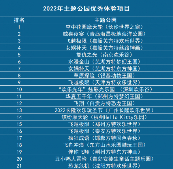 获评“2022年主题公园优秀体验项目”前五位的是空中花园摩天轮(长沙世界之窗)、鲸喜夜宴(青岛海昌极地海洋公园)、飞越极限(嘉峪关方特欢乐世界)、女娲补天(嘉峪关方特丝路神画)、复仇之光(南京欢乐谷);获评“2022年主题公园优秀演艺项目”前五位的是聊斋(大同方特欢乐世界)、天幕水极(上海欢乐谷)、聊斋(嘉峪关方特欢乐世界)、西施(常德卡乐星球欢乐世界)、梁祝(嘉峪关方特丝路神画)。