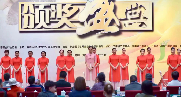 以党建引领,盛世兴茶,文化赋魂、科技赋能,推动乡村振兴和茶产业全链融合发展,稳步推进云南省“从产茶大省向产茶强省跨越的步伐”,促进云茶出滇,为实现云南省委省政府提出的到2025年实现“2000亿云茶”的宏伟目标。由昆明市茶业行业协会主办、联合国《世界生态》支持的“一带一路”滇茶杯第四届云南名茶评比大赛于2022年7月25在昆隆重开幕。五个级别的金象奖“茶王”相继出炉。熟茶组“茶王”由于总分未达98分,遗憾空缺。每一届恒定录取的76个获奖产品悉数绽放滇茶风采。盛大的颁奖典礼于11月19日晚在昆明海埂会堂载誉举行。