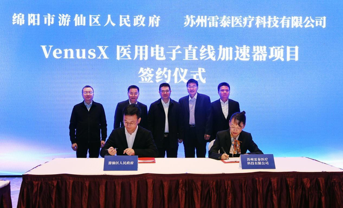 11月22日上午,绵阳市游仙区人民政府与苏州雷泰医疗科技有限公司就VenusX医用电子直线加速器项目合作事宜进行了深入交流座谈,并签署了合作协议。