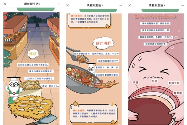打造让大众容易接受的健康科普,宣传常见胃病相关知识,让大众树立健康意识并养成正确的爱胃习惯,是好医生康复新品牌坚持爱胃爱健康系列公益活动的一切出发点。当下,焦虑、熬夜、不良饮食习惯,以及对肠胃信号的忽视加剧了胃病的年轻化趋势。好医生康复新品牌也逐渐在破圈科普的不断尝试中解锁更多的形式,品牌IP康小新也是如此顺应而生。2020年好医生集团“做个好人乐队”成立出道,首支MV《百胃人生》正式发行,康小新参演MV。2021年,康小新打卡成都地标建筑,联合25家知名品牌,和权威媒体一起科普健康。2022年5月,在好医生美洲大蠊养殖基地,“新员工”康小新上岗。8月上线《康小新的治愈旅程》三期系列漫画,通过微观视觉,康小新化身科普达人和修复战士,进入人体与细胞一同守护人体健康。9月联合权威媒体推出首个IP手绘逐帧动画《康小新的中医药文化之旅》,康小新带着好医生关于中医药的四问,开启一场中医药文化之旅。