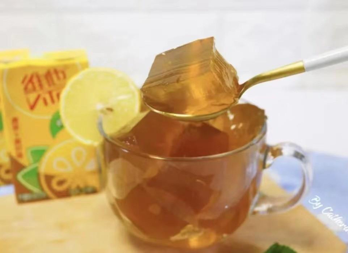 尝到“甜头”以后,今天就来自制维他柠檬茶冻啦。有多少宝贝是喜欢吃果冻的快举手!之前不知道果冻的做法竟然如此简单,只需要白凉粉或者吉利丁片以及维他柠檬茶就OK了。把维他柠檬茶和白凉粉搅拌在一起,在微波炉里叮一分钟,搅拌均匀晾凉,盖上保鲜膜,在冰箱冷藏至凝固就欧克啦!拿出来放到盘子里,Duang Duang Duang 的,和超市卖的果冻简直没差,加上维他柠檬茶的清香,好吃到爆炸,冰冰凉凉的简直不要太喜欢,实现零食自给自足啦!