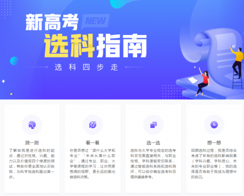 《新高考选科指南》是升学e网通生涯规划板块的重要组成部分,意在帮助学生做好生涯规划中第一个重要的决策,通过指导选科思路,帮助学生解决选科烦恼。《新高考选科指南》共分四步:“测一测”、“看一看”、“选一选”、“想一想”,由浅及深地带领学生发现自我,找到未来方向。
