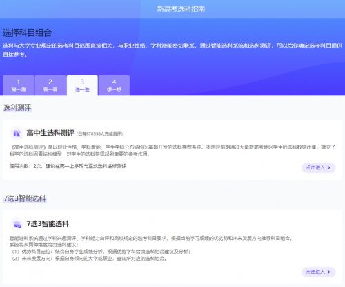 有了前两个板块的基础,学生们都会对自己的学习生涯有了较为清晰的规划。接下来的选一选板块就将采用更科学、更智能的方式,通过智能选科系统和选科测评,给学生们确定选考科目提供直接参考,让学生们坚定自己的选择。