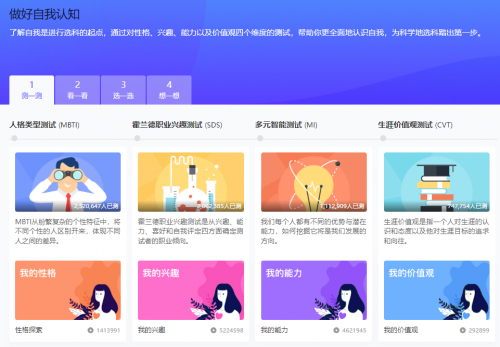 在测一测板块中,学生们可以通过人格类型测试(MBTI)、霍兰德职业兴趣测试(SDS)、多元智能测试(MI)以及生涯价值观测试来获取性格、兴趣、能力、价值观四个维度的认知,以更全面地认识自我,科学而自信地踏出选科第一步。