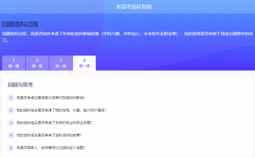 《论语》有言“三思而后行”,在真正确定自己的选科目标之前,升学e网通还会带领学生系统回顾整个选科过程,通过不同角度、不同方向的提问,确保学生们选择的学科是心仪的、适合的、科学的。
