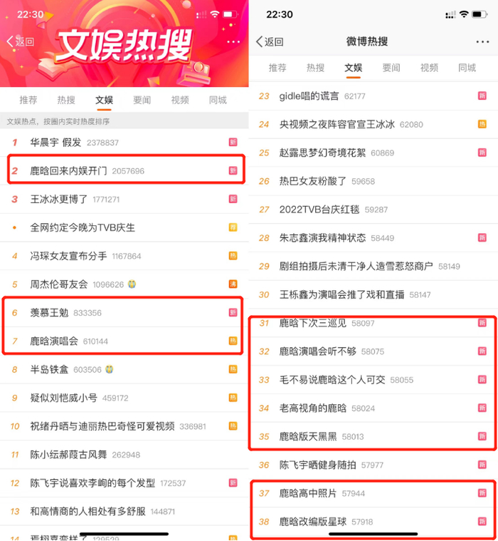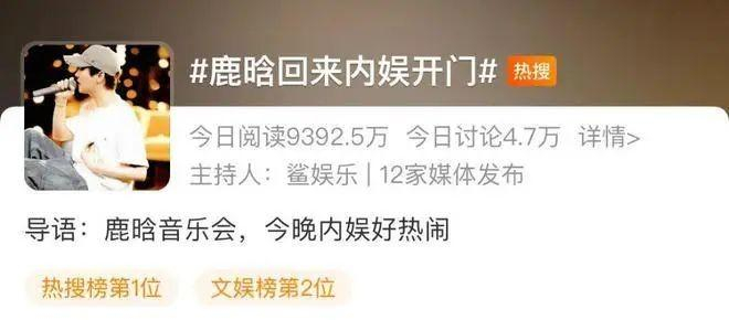 哥友会结束后1小时,周杰伦相关词条已从前十消失,“鹿晗回来内娱开门”则占领了热搜榜前三,而直到深夜了,从鹿晗本人、助演嘉宾到音乐会本身的多个热搜词条还在不断涌入热榜,真正实现了热搜霸榜。