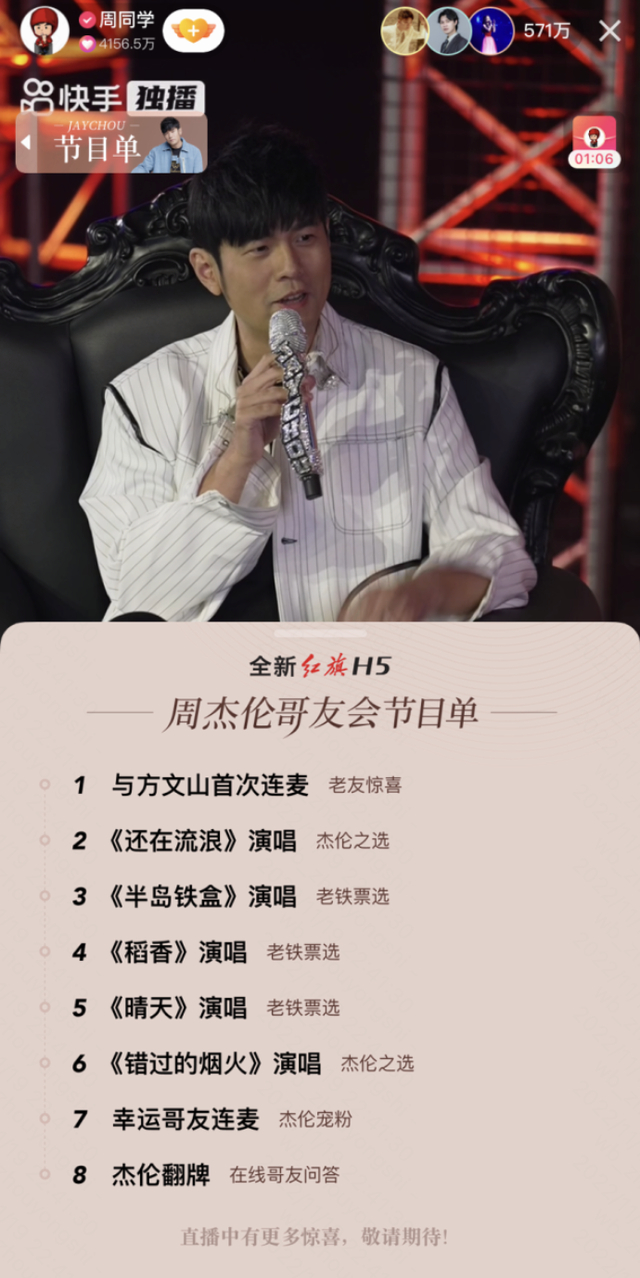 在“哥友会”现场,周杰伦演唱了五首歌,还与好友方文山、歌迷朋友连麦的互动。尽管只有五首歌的时间,总时长也只有一个多小时,歌迷们的热情还是通过数据体现得淋漓尽致。