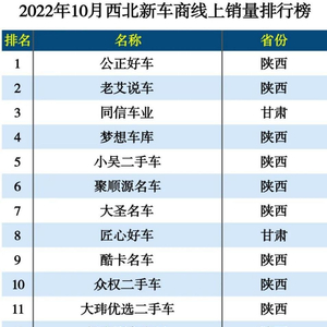 在2022年10月西北新车商线上销量排行榜TOP20中,陕西二手车新车商占比达90%,牢牢占据了榜单中的绝大多数席位。在TOP榜单中,陕西公正好车荣膺榜首,老艾说车位列第二。榜单前十名的其他陕西新车商分别是梦想车库、小吴二手车、聚顺源名车、大圣名车、酷卡名车、众权二手车。这份榜单的第十一至第二十名均来自陕西,他们是大玮优选二手车、好车到家车行、我有好车车行、盛泰轩名车、同城好车、兴盛行二手车、驭丰捷二手车、锦胜鸿远车行、葫芦二手名车、天达精品二手车。
