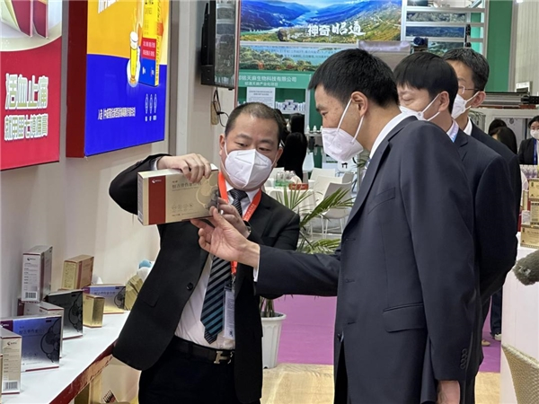 图:赛灵药业董事长曹智刚向玉溪市市委副书记、市长江华介绍恒古产品