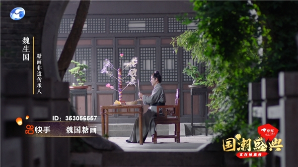 在不久前刚刚结束的快手与河南卫视联合播出的《国潮盛典》中,魏生国也受邀参与了晚会节目的录制。晚会利用新技术手段,构建了车水马龙的“京东大街”,魏生国在其中扮演了一位在街区上卖糖画的摊主,根据来往顾客属相现场制作了精美的传统糖画。