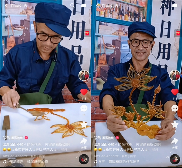 现在,魏生国的糖画徒弟已有1000余人,在他的带动下,越来越多人开始学习这项传统非遗手艺,借助短视频和直播谋求新出路。