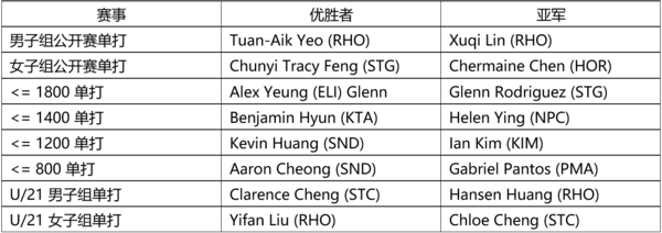 在女子组决赛中,Tracy Feng 4比1战胜了 Chermaine Chen,双方战况异常胶着。在男子组决赛中,TA Yeo凭借强大的乒乓球实力战胜了 Daiki Shimojo,后者是巡回赛中表现最稳定的选手之一。