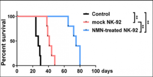 研究人员表明,NMN 增强的免疫细胞可通过抑制肿瘤显著延长小鼠的寿命。
