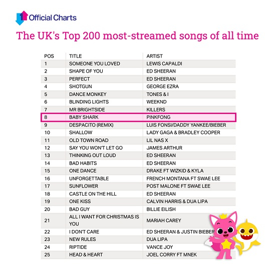 鲨鱼宝宝儿歌荣登UK英国音乐榜历史200大流媒体单曲排行榜第八位