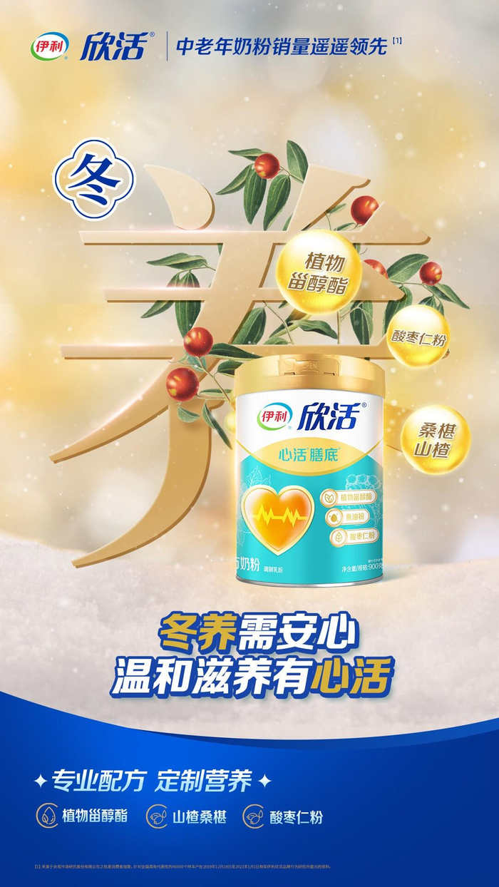 寒凉的天气里,人体血管收缩、出汗减少,刺激血压上升,加之活动量减少,血流速度减缓,老人受心脑血管疾病威胁更大。针对中老年人心脑健康需求,伊利欣活打造了心活膳底配方奶粉,在其中添加植物甾醇酯及鱼油,为中老年人提供双重营养守护,让他们更加“安心”。同时添加中式养生食材桑椹及山楂,温润养护心血管,酸枣仁粉则帮助中老年人凝神静气。值得一提的是,伊利欣活心活膳底配方奶粉是一款专利配方奶粉,荣获《一种降血脂奶粉及其制备方法》发明专利,来自伊利欣活的专利级营养方案,让中老年人温和养心,舒畅过冬。